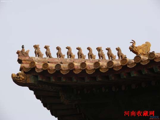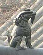 三、 嘲风,形似兽,是老三,平生好险又好望,殿台角上的走兽是它的遗像。这些走兽排列着单行队,挺立在垂脊的前端,走兽的领头是一位骑禽的“仙人”,后面依次为:龙、凤、狮子、天马、海马、狻猊、押鱼、獬豸、斗牛、和行什。它们的安放有严格的等级制度,只有北京故宫的太和殿才能十样俱全,次要的殿堂则要相应减少。嘲风,不仅象征着吉祥、美观和威严,而且还具有威慑妖魔、清除灾祸的含义。嘲风的安置,使整个宫殿的造型既规格严整又富于变化,达到庄重与生动的和谐,宏伟与精巧的统一,它使高耸的殿堂平添一层神秘气氛。