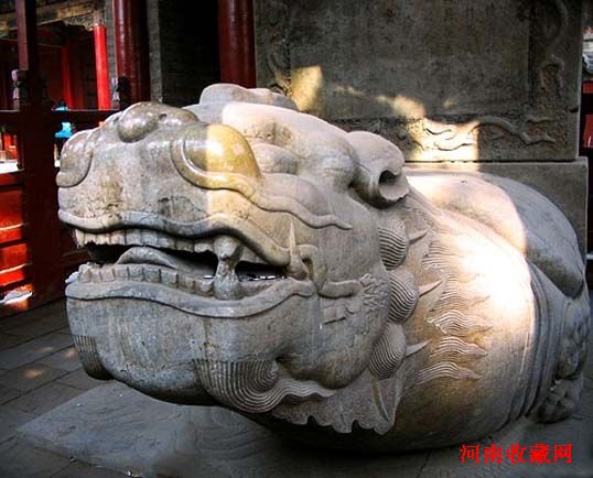 六、赑屃(音bì xì),形似龟,是老六,平生好负重,力大无穷,碑座下的龟趺是其遗像。传说霸下上古时代常驮着三山五岳,在江河湖海里兴风作浪。后来大禹治水时收服了它,它服从大禹的指挥,推山挖沟,疏遍河道,为治水作出了贡献。洪水治服了,大禹担心霸下又到处撒野,便搬来顶天立地的特大石碑,上面刻上霸下治水的功迹,叫霸下驮着,沉重的石碑压得它不能随便行走。霸下和龟十分相似,但细看却有差异,霸下有一排牙齿,而龟类却没有,霸下和龟类在背甲上甲片的数目和形状也有差异。霸下又称石龟,是长寿和吉祥的象征。它总是吃力地向前昂着头,四只脚拼命地撑着,挣扎着向前走,但总是移不开步。我国一些显赫石碑的基座都由霸下驮着,在碑林和一些古迹胜地中都可以看到。