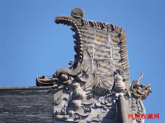 九、螭吻(音chī wěn,也做“鸱吻”),又名鸱尾、鸱吻,龙形的吞脊兽,是老九,口阔噪粗,平生好吞,殿脊两端的卷尾龙头是其遗像。《太平御览》有如下记述:“唐会要目,汉相梁殿灾后,越巫言,‘海中有鱼虬,尾似鸱,激浪即降雨’遂作其像于尾,以厌火祥。”文中所说的“巫”是方士之流,“鱼虬”则是螭吻的前身。螭吻属水性,用它作镇邪之物以避火。
