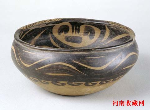 钵敛口,折沿,鼓腹,腹以下渐敛,小平底。橙黄色泥质陶,表面打磨光滑。钵内、外及口沿均以黑彩描绘纹饰。钵内饰以底为中心的漩涡纹,外壁为波浪纹,口沿为三组菱形网格纹。此器造型饱满,图案线条流畅,是马家窑类型彩陶的典型器。