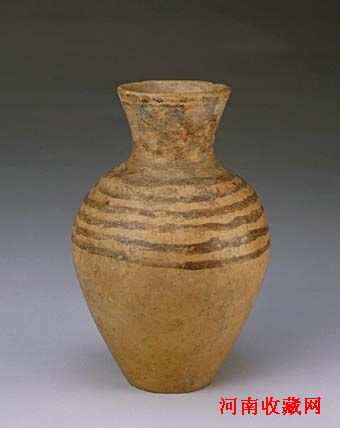 瓶陶质,敞口,束颈,鼓腹,腹下渐收,平底。器表光滑,上腹部彩绘弦纹六周,纹饰简洁明快,朴素大方,有很强的装饰性。此类弦纹是马家窑文化中马家窑类型彩陶的常见纹饰。