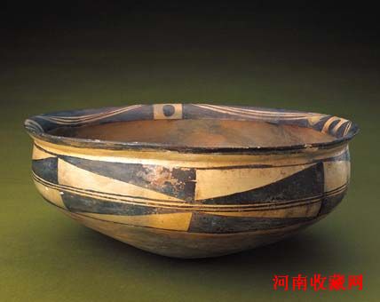 盆折沿,深直腹,圜底。泥质红陶。口沿及外腹部均以黑彩描绘纹饰,口沿上描绘以点定位的水波纹,腹部描绘两层三角形几何纹,两层纹饰中三角形的大小及形状相同,但方向相反。这种三角形纹饰可能是由鱼纹逐渐抽象演变而来。此彩陶盆的造型和纹饰具有新石器时代仰韶文化半坡类型的明显特征。