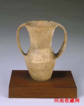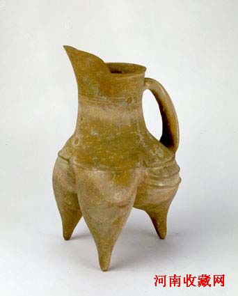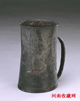 杯呈筒形,腹间微收,平底,杯身一侧有扁形把,便于持拿。杯为轮制而成,杯身均匀地分布三道弦纹。