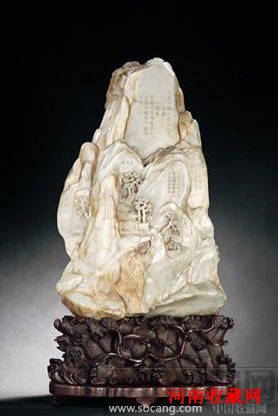 玉面附乾隆御题诗之黄山三十六峰(赠康熙皇二十一子慎郡王允禧),乾隆帝精通诗文,长于古物鉴赏,常在他鉴赏过的器物上写、刻御题诗文或跋文,尽显其儒雅之气。旧配雕花木座。此件拍品估价达千万元。