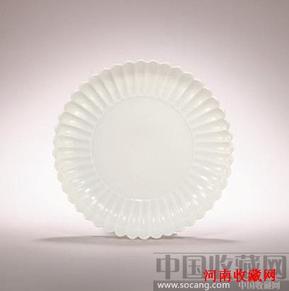 另一件<清雍正白釉菊式盘>,敞口浅腹,口沿微外撇,浅圈足,腹部饰以均匀菊瓣状。底书青花“大清雍正年制”六字双行楷书款识。菊花瓣式盘是清代雍正御窑名贵品种,也是雍正朝极富特色的艺术品,其造型高贵典雅,工艺精巧,拟取秋菊之形状,线条优美舒畅,尤具自然清新气息,其釉光鲜亮细润,胎体细薄,阳光能透。隽秀的造型配以匀净莹润的釉色,无不彰显脱俗超逸的艺术意念,实为绝妙之作。然于制瓷技术上,又颇费心力,成型、烧造皆为巧夺天工,故存世非常有限,在清廷档案中便有烧造数量的明确记录:“雍正十一年十二月二十七日,内务府总管年希尧家人郑天赐送到各色菊花式盘十二色,内每色一件。司库常保、首领太监萨姆哈呈览。奉旨:着交与稍早瓷器处,照此样每式烧造四十件。”此种菊瓣造型,取材自宋代漆器,送人对句话的喜爱有着品格上的暗喻,菊花的淡泊与孤傲,无疑是仰慕宋风的雍正所珍视的,如此菊瓣盘便可窥其文化诉求之所在。