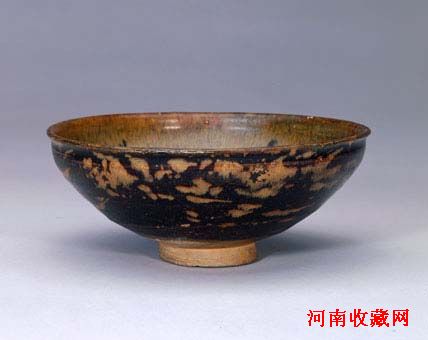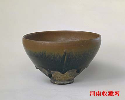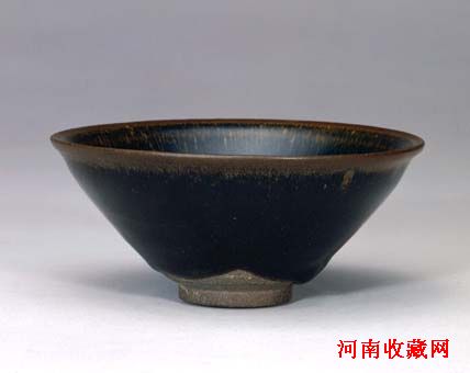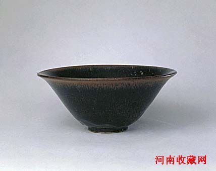 器口外撇,斜壁,浅圈足。通体施黑釉,釉面呈现黑、褐相间的兔毫纹,满釉至底足,器外口沿釉色呈黑黄褐色。