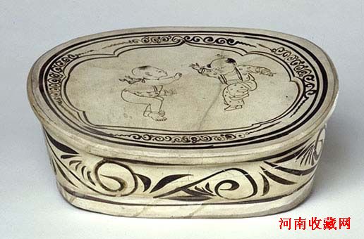 磁州窑白地黑花婴戏纹枕,宋,高10.4cm,长29.9cm,宽22.5cm