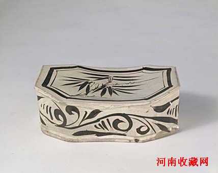 枕呈长方多边形,枕壁有八面,枕面和底部均出边。枕面与枕壁均有白地黑花装饰,枕面为篁竹一丛,枕壁为卷草纹。
