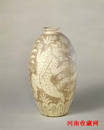 瓶形似橄榄,圈足。胎为灰褐色,施白色化妆土。瓶身刻划二虎,一站立,一行走,呲牙翘尾,均矫捷凶猛, 搏斗于草丛中,衬以洞石、芭蕉,近底处有一周莲瓣纹。图案以外空白处戳印珍珠形小圆圈。