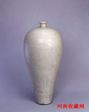 瓶小口折沿,短颈,丰肩,肩下渐收敛,圈足。俗称“梅瓶”。通体施白釉,釉色柔和洁净,白中闪黄。肩部刻菊瓣纹一周,腹部刻缠枝莲纹,下部刻上仰蕉叶纹,刻花清晰婉转,深浅不一,莲花简洁典雅,线条流畅,显示出定窑刻花技术的娴熟。此瓶造型挺拔,是宋代定窑梅瓶的标准式样。