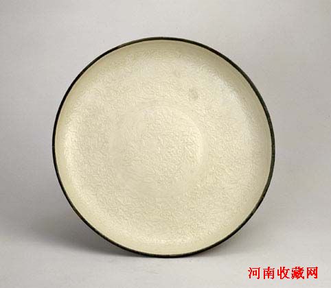 定窑为宋代五大名窑之一,以烧白瓷为主,细润光滑的釉面,白中微微闪黄。装饰以印花、刻花、划花与剔花为代表,尤以印花技法为世人所称道。这件印花缠枝牡丹莲花盘器型大而规整,印花繁缛,层次分明,线条流畅,纹饰清晰,充分显示出定窑印花品种的制作水平之高,是清宫旧藏的定窑器之珍品。