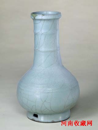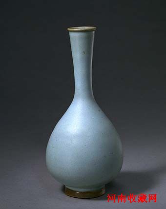钧窑被称为宋代五大名窑之一,其主要釉色有月白、天蓝、紫红等,胎重釉厚。此瓶为宋钧窑的民窑产品。民窑器物形制多为碗、盘、瓶、罐之类生活用品,釉色以天青或天蓝釉居多,无官钧之玫瑰紫和海棠红色。此瓶造型别致,釉色匀净,为民窑中较好的作品。