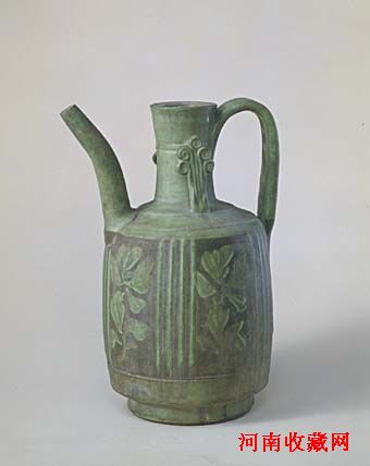 执壶撇口,直颈,四瓣瓜棱形椭圆腹,一侧置弯曲的长流,另一侧置曲柄,流与柄之间有双条形系,圈足。外底刻有“太平戊寅”四字。通体施青绿色釉。“太平戊寅”即北宋太平兴国三年(978年)。