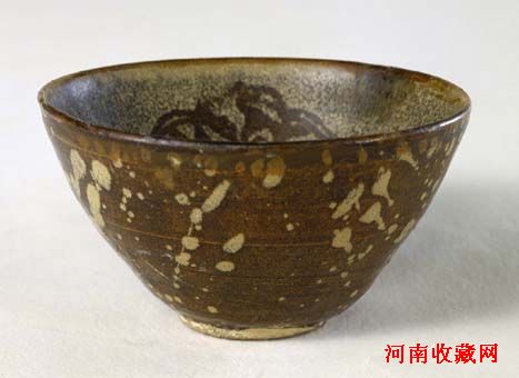 此盏口径较大,线条流畅,造型十分优美。虽然它的胎、釉、造型都与建阳窑黑釉盏明显不同,例如,前者胎为白色,而后者为紫黑色胎,但它仍属于建阳窑类型器物。宋代黑釉茶盏以福建建阳窑烧制的产品最为著名,烧造量也很大,其他地区如四川、山西、江西、河北、河南等地也有烧制。