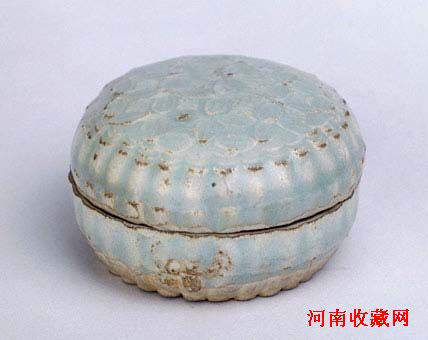 盒呈菊瓣形,子母口,平底,造型精巧别致。盖面印有密集的锦纹,纹饰模糊不清。盒里外施青白釉,施釉不到底,露胎。外底印有“蔡家盒子记”。