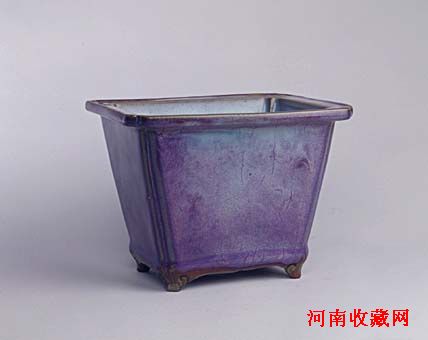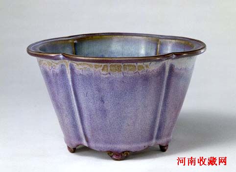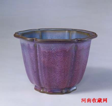 花盆六瓣葵花式,折沿,口沿边起棱,深腹,圈足。盆内外施釉,口沿以内呈灰蓝色,外呈玫瑰紫色,口沿下流釉,凸棱处釉薄呈酱色。