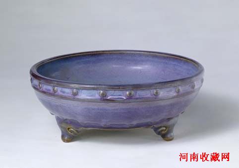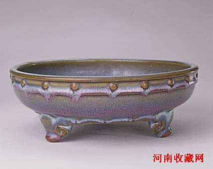鼓钉洗是钧窑瓷器中常见的造型品种,这种富于装饰性的器物配以如意头形足活泼轻巧,匠心独具。此为宋代宫廷陈设用瓷。