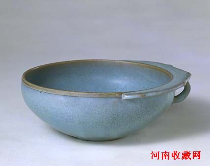 洗有陶和瓷制品,陶洗从新石器时代至汉代均有制作,瓷洗以唐代越窑、宋代钧窑,尤其是元代龙泉窑和景德镇窑的制品为多。钧窑大部分产品的基本釉色是各种浓淡不一的蓝色乳光釉,较淡的蓝色称天青,较深的称天蓝,此件比天青更淡,故称月白,具有萤光般的幽幽光泽。