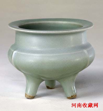 此炉釉色为典型的梅子青色,青翠幽雅。炉腹至足部凸起的三条棱线原系仿青铜器的装饰纹样,因凸起处釉层较薄,呈浅白色,形成了出筋的装饰效果,翠玉般的釉色中显露出数道规整的白线,分外醒目。此炉造型仿青铜鬲,因此又称鬲式炉,是龙泉窑的上乘佳作。