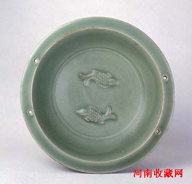 此洗敞口,折沿,圈足。洗心内塑贴两条游鱼,外壁刻凸菊瓣纹一周。口沿两侧各有两个穿孔,相互对应,可用于穿饰金属提环,以便于提携。此器釉色青翠,塑贴鱼纹清晰,是南宋龙泉窑的典型作品。在韩国新安海底沉船中亦发现有类似器物。