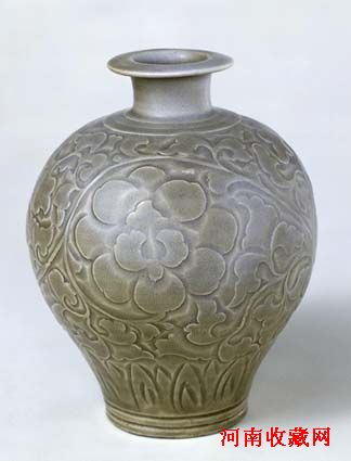 耀州窑刻花青瓷以盘碗为多,瓶类较少。此瓶小口短颈,衬出瓶身的雍容饱满,刻线处积釉色深,凸起处色较浅,使花纹更加清晰,有立体图案的效果,为耀瓷中的精品。