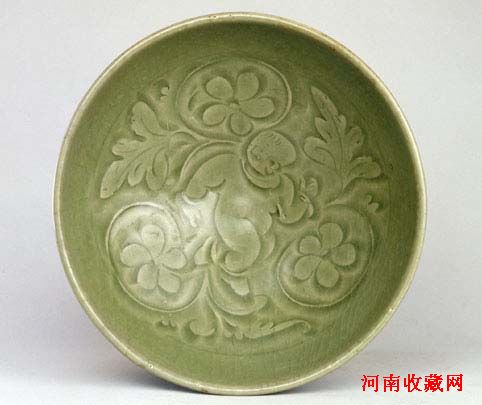 菊花及各种花卉是耀州窑十分常见的装饰题材。此碗独到之处在于它采用特有的犀利刀法将抽象的菊花花瓣与形象的菊花花朵巧妙地结合在一起,这种简捷明快的图案使人感受到大自然的气息。