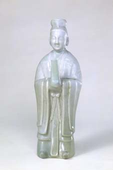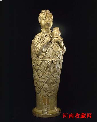 这是一尊宋代耀州窑烧造的青釉塑像,塑造一中等身材的伫立男像。其形像昂首挺胸,双目炯炯有神,平视前方,两腮微鼓,双唇紧闭,神态安详。头戴蝴蝶结饰物,身披由树叶缀连而成的长衣,左手托宝瓶,右手执草叶于胸前,腰间系一布带,赤足立于圆托上。通体罩青中略带黄色之釉。