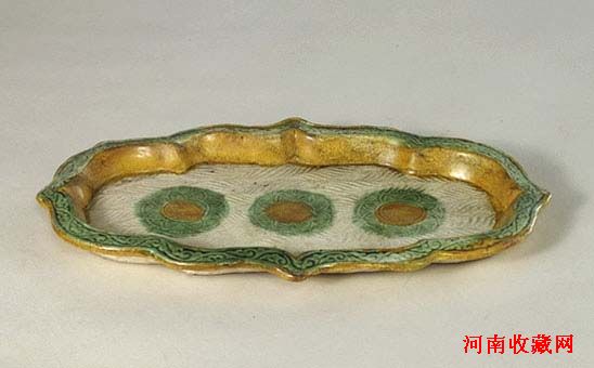 盘四方花口,口微敞,平底。盘内四面立壁均分饰2开光,每开光内饰花卉1朵,花卉两侧对称饰卷云纹。盘内底四角饰叶纹,底心模印团菊1朵。盘内施黄、绿、白三色釉彩,盘外施半釉。