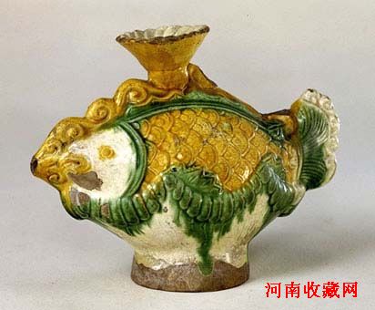 壶仿鱼形,造型设计巧妙。鱼背部正中为一喇叭状菊瓣花口,一侧为提梁,已残失。鱼嘴为壶流。鱼身、鱼鳍、鱼尾用不同的釉彩装饰并刻划不同的花纹,鱼腹下饰一荷叶,托起鱼体,荷叶下为平底实足。通体施黄、绿、白三色釉。