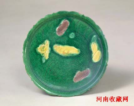 盘口呈九瓣菱花形,盘心坦平,浅壁,圈足。盘内三彩釉下有刻划的鹭鸶莲花纹。其做法是先用铁锥在胎上划出图案线条,经素烧以后施以绿釉,再在莲叶上涂葡萄紫色釉,鹭鸶与莲花上涂黄色釉。
