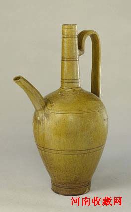 壶直口,细长颈,丰肩,长圆腹,圈足。一侧为八棱形壶流,流细长弯曲,根部饰一皮扣状装饰,另一侧为带状长柄,连于颈肩。自壶口至近足处,通体饰弦纹6组。器身施黄釉,釉面光亮莹润。