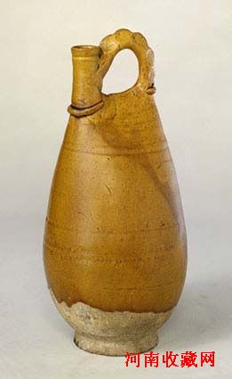 壶为葫芦形,上小下大,上为唇口,口下如蛋形,中部束腰,下腹圆而硕大,底为圈足。肩部饰弦纹两道,一侧为曲状流,另侧为环形长柄,柄上印阳纹卷枝纹,柄下饰一乳钉。通体施黄釉,近足部露胎,足边有5个支烧痕,釉下施白色化妆土。
