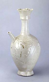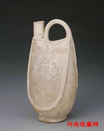 此壶扁圆形,短流,肩上有一提梁,圈足。通体施白釉,壶身两面刻花叶纹。此器朴素粗犷的风格反映了游牧民族豪放的气质。