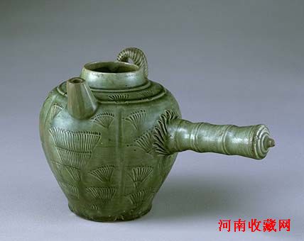 壶小口,口内收,壶身为四瓣瓜棱形,肩部一侧有多棱形短流,相对应的另一侧为双条绳形系。壶腹一侧有竹节形横柄,柄端凸起一小钮。肩部饰双凸弦纹,通体刻划大小扇形纹,柄与壶身连接处以螺旋形刻划花纹巧加修饰,十分别致。壶施绿釉,鲜翠欲滴,明亮可爱。