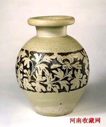 此罐造型饱满端正,牡丹纹饰花繁叶茂,生机盎然,花叶上辅以篦划纹。纹饰以外涂以黑彩,形成黑地白花,与磁州窑白地黑花器有异曲同工之妙。