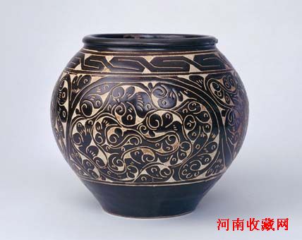 缸唇口,鼓腹,圈足。缸内口部施黑釉,外壁以黑釉剔花装饰,肩部为变形回纹,腹部为缠枝花草纹。外底无釉。