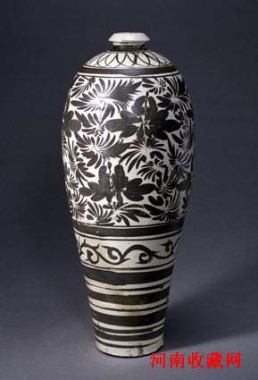 瓶唇口,短颈,溜肩,上部丰满,腹下渐敛,宽圈足。瓶身以白地黑花为饰。肩上绘图案形莲瓣纹一周,腹部绘缠枝花卉纹,腹下饰卷枝纹一周,每组纹饰间及瓶身下部均隔以粗细线纹数道。素底无釉。