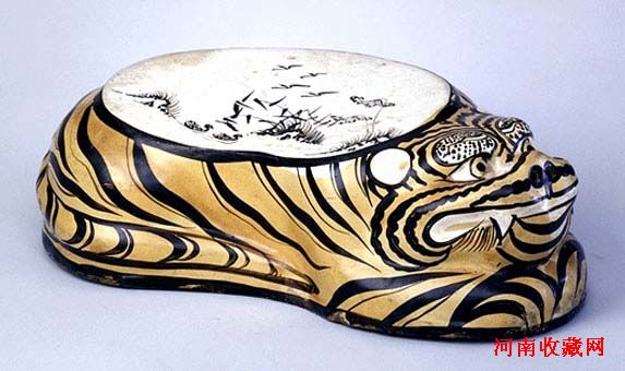 枕呈卧虎形,头右向。虎身为枕身,在黄地上绘黑色条纹模仿虎皮纹。虎背为腰圆形枕面,枕面白地黑彩,画残荷两枝,芦苇数茎,水草游鸭,空中大雁南飞,寥寥数笔,将秋景萧瑟的意境表现得淋漓尽致。