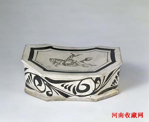 宋、金、元时期瓷枕品种多样,形式纷繁,主要用作寝具,同时也用以随葬。其中磁州窑瓷枕最具代表性,枕的造型各式各样, 品种繁多,纹饰内容多取材于民间生活,装饰手法采用绘、刻、印、划、剔、镂等,特别是白地绘黑彩,运用豪放的笔法,娴熟的技巧,在不到半尺的枕面上挥洒自如,将绘画艺术巧妙地运用到瓷枕装饰上,具有浓厚的水墨画风格。此枕色彩黑白分明,对比强烈,寥寥数笔,把马戏表演中的精彩瞬间表现得淋漓尽致,富有浓郁的民间生活气息。