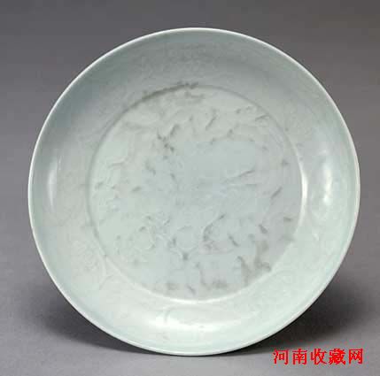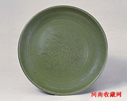 盘敞口,浅腹,坦底,圈足。里外施青釉,底部无釉,露胎处呈火石红色。盘心模印云龙纹,内壁刻划花纹。此盘器形较大,胎体厚重,釉呈青黄色,在较厚的釉层下模印的云龙纹清晰可见,据此表明这是元代龙泉窑青瓷的典型器。