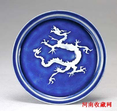 盘折沿,浅壁,平底。通体内外施蓝釉,外底无釉。盘心坦平,在蓝釉地上以白色泥料塑贴一条矫健的白龙。龙细颈,三爪,作昂首翻腾状。