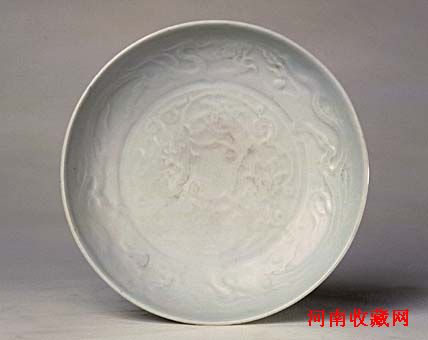 盘直口,浅弧壁,圈足。胎体坚致洁白,里外施白釉。盘心及内壁模印云龙纹。