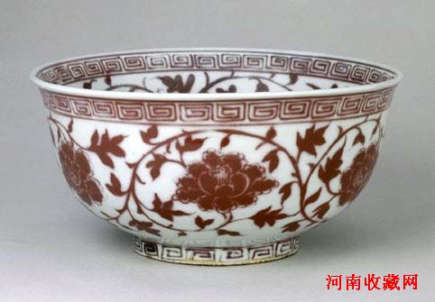 碗墩式,口微外撇,圈足。通体白地红花,内外口沿各绘回纹一周,碗内壁为缠枝菊纹,碗心双圈内饰折枝花卉纹,外壁绘缠枝牡丹纹,足外墙绘回纹一周。