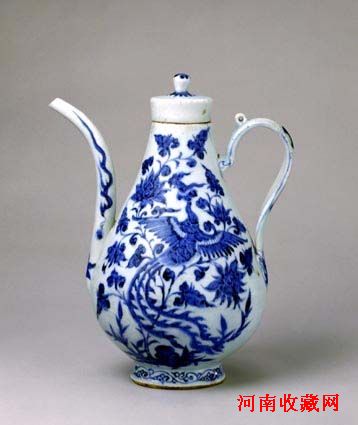 壶直口,口下渐展,粗颈,垂腹,腹下内敛,圈足微外撇。腹一侧安有上细下粗的长弯流,另一侧有如意形把柄,柄上端安小系。平顶盖,圆珠钮。底白釉,无款识。流绘以火云纹,柄有银锭、宝钗等纹饰,盖绘菊瓣纹。器身于青白釉下满饰青花纹样,腹两面均绘凤穿缠枝花卉图案,并间以火珠云及竹石纹。