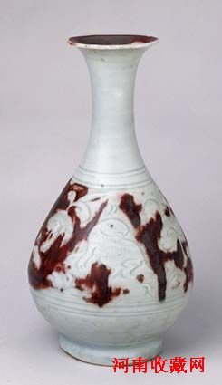 玉壶春瓶是元代景德镇瓷的常见器型,其品种除釉里红外,尚见有青花、青白釉、孔雀绿釉青花等。由于釉里红瓷器烧造难度大,传世较少,故愈珍贵。以釉里红装饰的玉壶春瓶,除北京故宫收藏的这件之外,还有日本大和文华馆及松冈美术馆收藏的釉里红飞凤纹玉壶春瓶、英国伦敦大维德基金会收藏的釉里红花卉纹玉壶春瓶等。