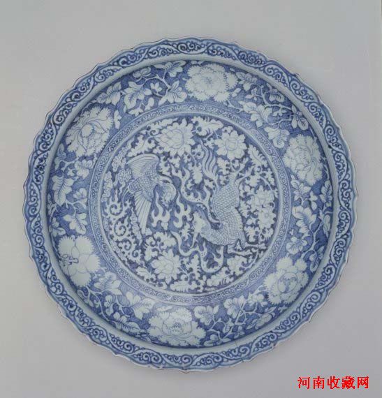 元代青花瓷器装饰有两种形式:一种以白色为地,蓝色为花,用青花原料直接在白色胎体上进行绘制。另一种是青花为地,以湛蓝青翠的地色衬托出白色的花纹。青花麟凤纹盘为蓝地白花器之代表作,表现出与白地蓝花器完全不同的艺术效果。此类器之传世品极罕见,凤毛麟角,世之珍品。