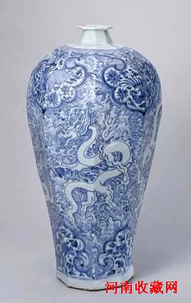 梅瓶胎骨厚重,小口平沿,颈细短。瓶身修长,有八棱。肩饰斜格锦纹,锦纹下一周大如意云头纹,内绘凤或麒麟穿牡丹图样,瓶身中部一周绘4条白龙,衬以青花海水和火焰纹,近足处饰一周如意云头纹,内绘牡丹花叶。
