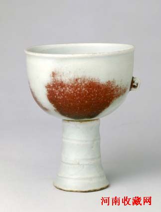 杯撇口,深腹,瘦底,下承中空竹节式高足。通体施青白釉。杯身涂抹3块釉里红斑,并置一小圆系,杯底和高足以子母榫相衔接,可以自由转动而不脱开。