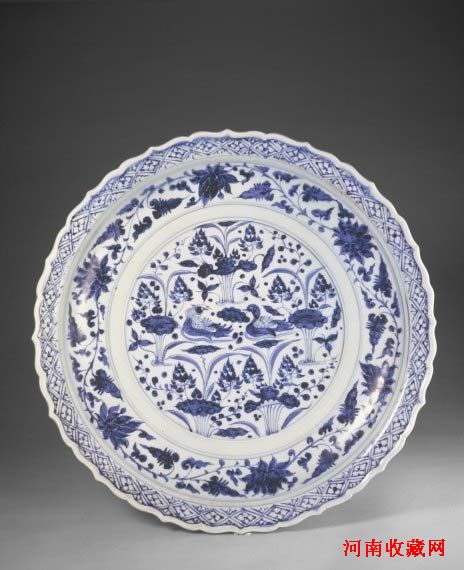 此器造型美观大方而规整,为元代典型盘式。其绘画精致,纹饰构图严谨,以多层带状辅纹衬托主题花纹,各层花纹间以青花双圈线相隔,装饰饱满但主次分明。青花色泽艳丽,系用进口的苏泥勃青料。此盘为元代晚期景德镇窑青花瓷器之精粹。