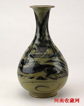瓶撇口,细颈,垂腹,圈足。通体施青黄釉,外壁以青花绘蕉叶、莲瓣、鱼藻纹。